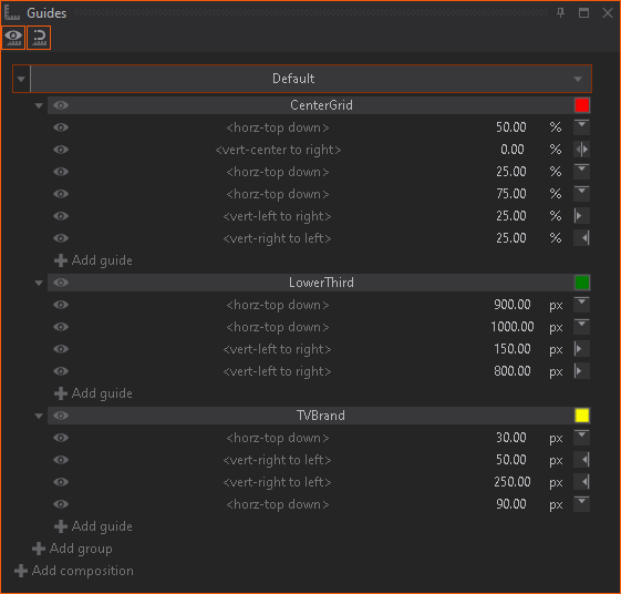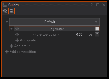 Default is used as used composition, for <group>, with one <horiz-top down> guide line at 0.00 % with top alignment.