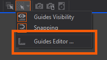 To show the Guides Editor use the View -> Guides from the top bar or use the drop down menu in the toolbar for "2D - In Scene Edit Mode" click Guides Editor button: