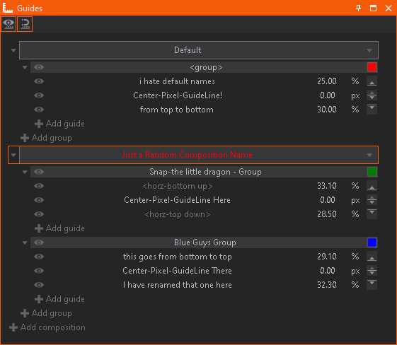 Each group can have its own color. It is possible to have several groups within one composition. To rename a group double click the <group> name and assign a different name. To assign a different color to the group, click the color-box to bring up a color palette. The 'Guide Lines within this group will be colored with the selected color.