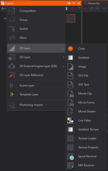 New 2D layers can be added by pressing the small + in the top left corner of the Layer Editor, and selecting the type of 2D layer you would like to add from the drop-down menu. One of the most commonly used types of 2D layer is an Image Layer. This is a basic 2D Layer that allows you to directly import images into Ventuz and manipulate things like orientation, blending or the mapping of the image.