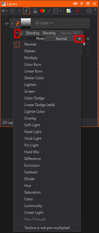 To access the different blending modes, you need to expand the Blending property group by clicking the small triangle next to Blending, and then click the the Mode drop-down menu.