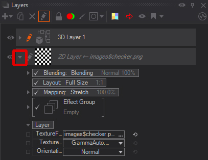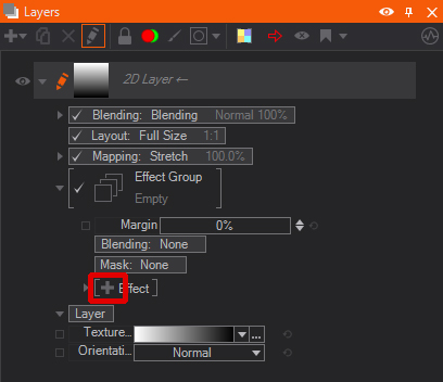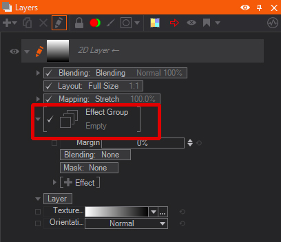 Layer Effects can also be found in the Layer properties. You can access these different Layer Effects by clicking the small triangle to expand the Effect Group properties.