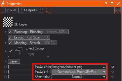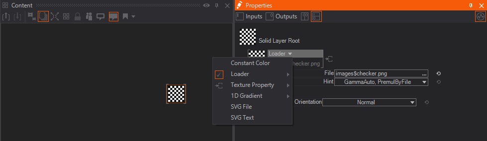 icon for the specific layer, and looking inside of the Content Editor. This root node contains the Texture Loader where additional properties can be edited, predefined images can be selected, or you can change the whole Texture property to something different