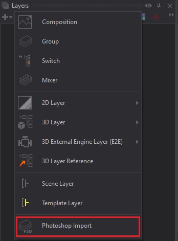 To add a new Photoshop Layer, click on the small + on the Layer Editor, and select Photoshop Import from the drop-down menu.