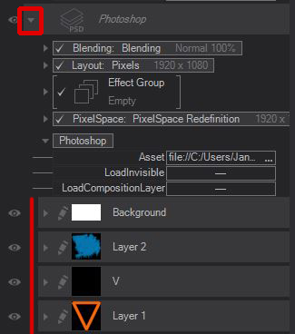 To import a Photoshop file, click the small triangle on the newly added Photoshop Layer to expand its properties. Then, click on the three dots in the Asset field and locate the Photoshop file you would like to add using the Open dialog.