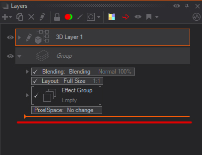 Adding additional Layers to a Group Layer is done by pressing the small triangle to expand the Group Layer properties, and then click dragging the Layer you would like to add into the Group Layer properties area. An orange line will indicate where the selected Layer will be moved to after the mouse button is released.