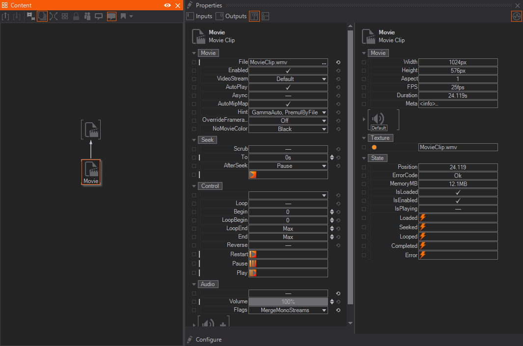All options that are present on the Texture Loader are also present on the Movie Clip Node. Additionally you have a set of options that can be adjusted with the Configure button at the bottom of the Properties Editor (you need to select the node in the Hierarchy or Content Editor to see it).