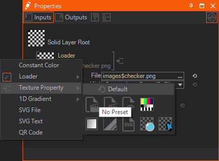 The Texture Loader Node is located in the Texture category of the Toolbox. Placing this node in the Content Editor enables you to bind its Texture output property to any rendering node. For this, the rendering node needs to change the default Image Loader Property Group to a Texture Property Property Group. This can be done with the drop down menu next to the thumbnail of the Property group: