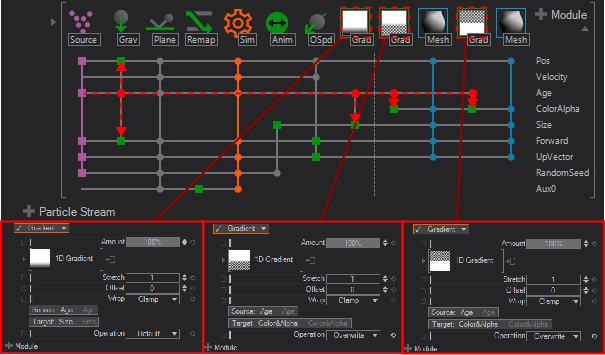 The Source particle starts with an Age, the Age is used for several modifiers, like the Gravity, and three times by the Gradients. In the case for the Gradients you can see that the Source is the Age and the Target for each Gradient is Size and two times for the ColorAlpha. That means for the over time (Age) the color or alpha (ColorAlpha) will change for the particles. So by analyzing the Fretboard you can see what individual channels control or where they are used for - at which point a value gets grabbed and modifies something else.