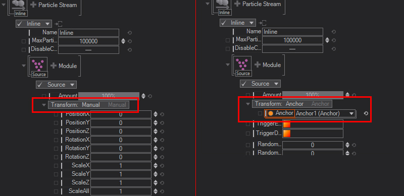 You can use the Transform property to change for example the position of a particle system. One of the best use cases is to have the Particle System follow your mouse position. To do so you can bind the X/Y/Z values of the particle system transformation to your actual mouse cursor position. Another useful option is to use the Anchor and the Anchor node instead of a manual transform.