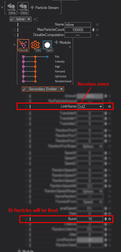 The Secondary Emitter makes it possible to hook another stream onto an existing particle by using the LinkName. This way it is possible to create trailing particles, which follow a single particle which has been emitted by another emitter. If you combine the Secondary emitter with events from another module you can trigger the burst of the secondary emitter to emit particles as well. A good example of this is a raindrop creating a splash when it hits the ground or a firework rocket. Please refer to the Buffers and Events section in this document.