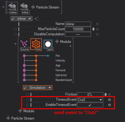 Events can be send upon a hit on the collsion or a bounce off the surface, if a particle is dead because its lifetime is exceeded or manually by using the Touch module.