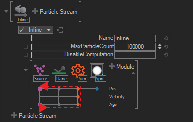 The Particle System will create a simple and empty particle node which has no inline stream nor any kind of module or modifier. You would need to create the inline stream and the according modules on your own, you start with the very basic empty particle system in this case. The Particle System - (Source + Sprite) starts with a very basic system, which contains of an emitter (Source) and a renderer to at least create a basic fontain without gravity. The last system is used to have a rough starting point and is good for basic "try outs". The mentioned Inline Stream is basically where you start a particle system in. The stream goes from module to module and therefore changes or alters the behavior of a particle - they read and write to the attributes. Basically the most compact stream would be the Particle System (Source + Sprite), it contains as mentioned above just of a source emitter and a renderer. Therefore the stream would look like : Particle got born - "emitted", has basic values like lifetime, size and direction and got "rendered"... and hence the lifetime it will die. As another alternative to understand the inline stream or the stream itself the section for the fretboard would be a good further reading.