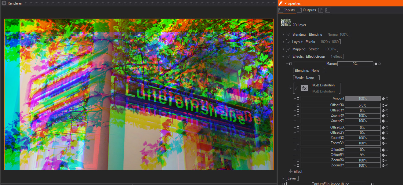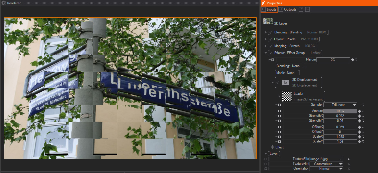 A standard 2D displacement effect, it displaces the Image or Layer pixels according to the Luminance information of an external image or Movie file. Due to this, it is always a good idea to use a very contrasted image to see the effect to its full strength. Generally a Black Texture will move the pixels to the top left while a white texture will move them to the bottom right.