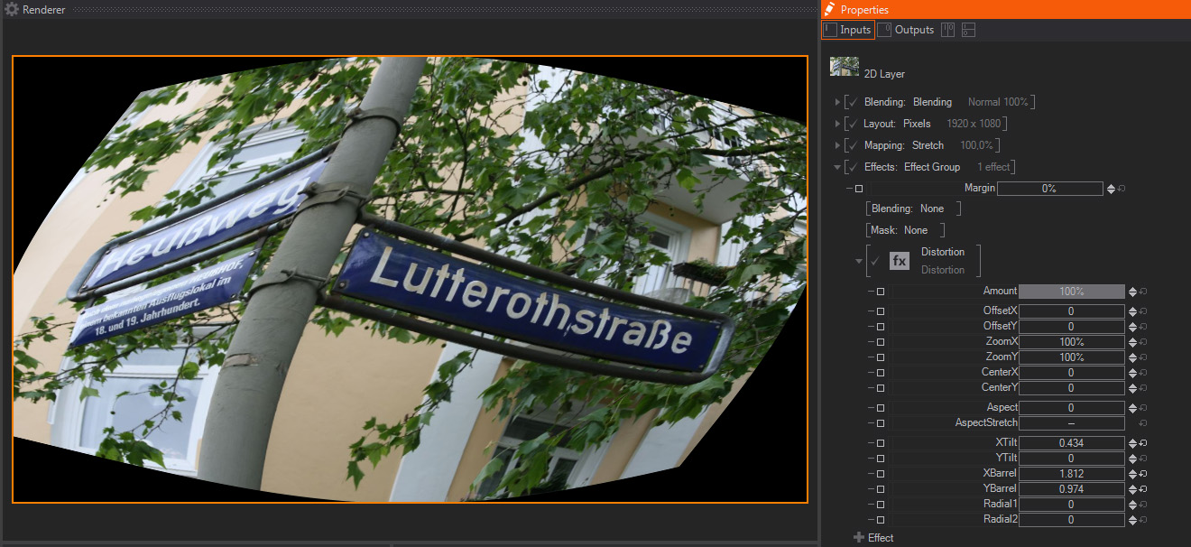 This distortion effect replicates the typical Barrel and Pin Cushion aberrations associated with optical lenses. It is based on the same maths used for Lens calibration in virtual workflows, and therefore it includes controls for the sensor size, zoom and the like. The parameters available are: