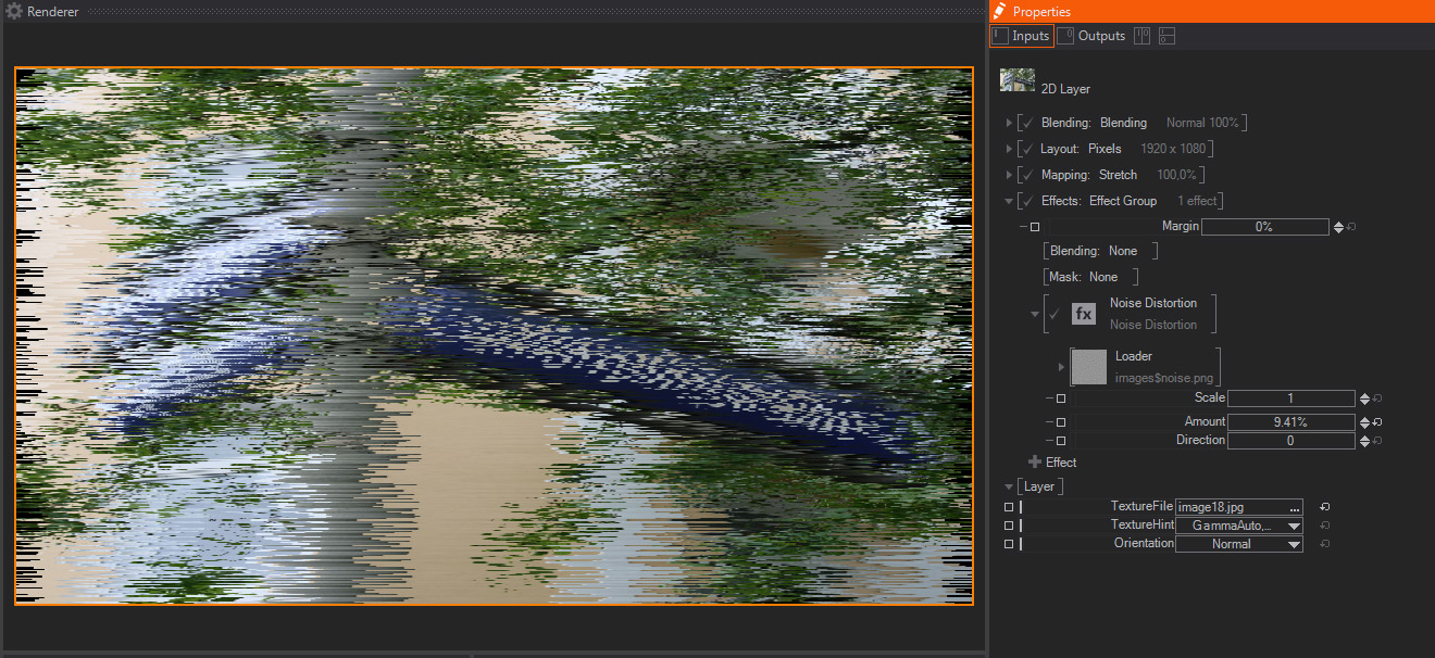 This effect is very similar to the 2D Displacement effect above, but the external Image file is randomly animated to create a fake Noise Displacement effect. It features less and simpler controls than 2D Displacement, the available parameters are: