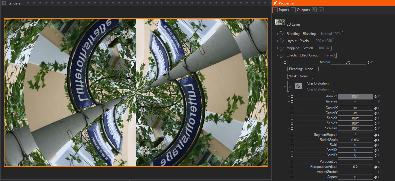 Polar Distortion is a distortion effect that transposes the x and Y pixel coordinates in the original image to a Polar Coordinate system, which is similar to the Longitude and latitude coordinate system used for Geographical positioning. As a result of this transpose conversion, the resulting images are heavily distorted, offering some very interesting results. These are the parameters available: