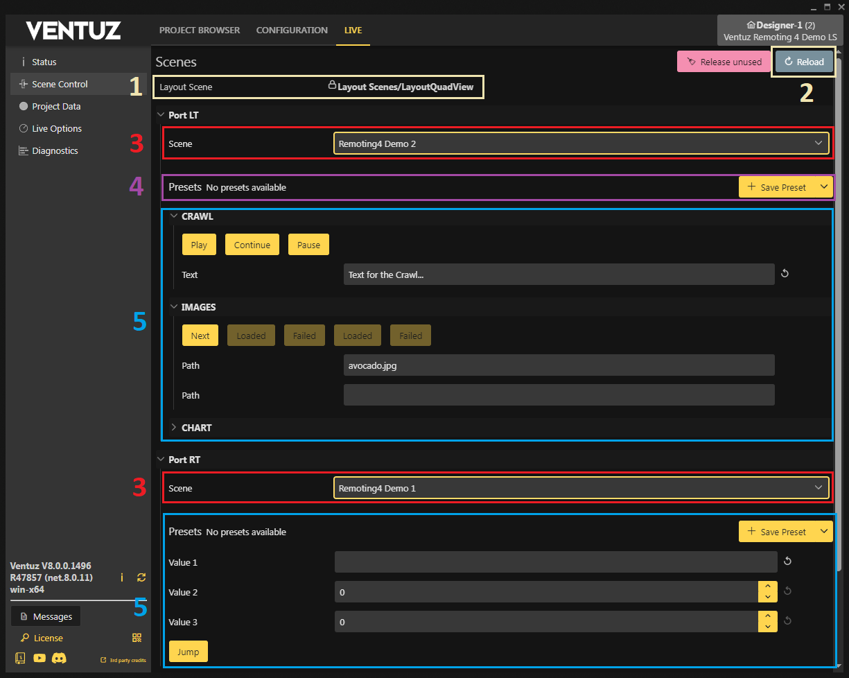 • 2: With the Reload Button changes on the Scene Data can be loaded. For example: If you are editing the Scene Data in Designer or adding some properties, these changes will be visible by pressing Reload.