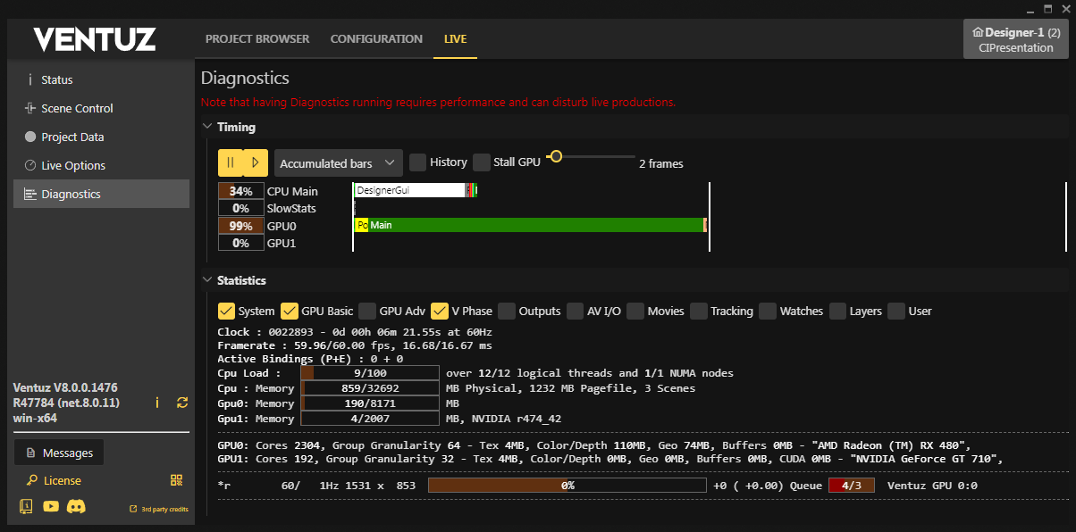 Having the Diagnostics running requires performance and can disturb live productions!