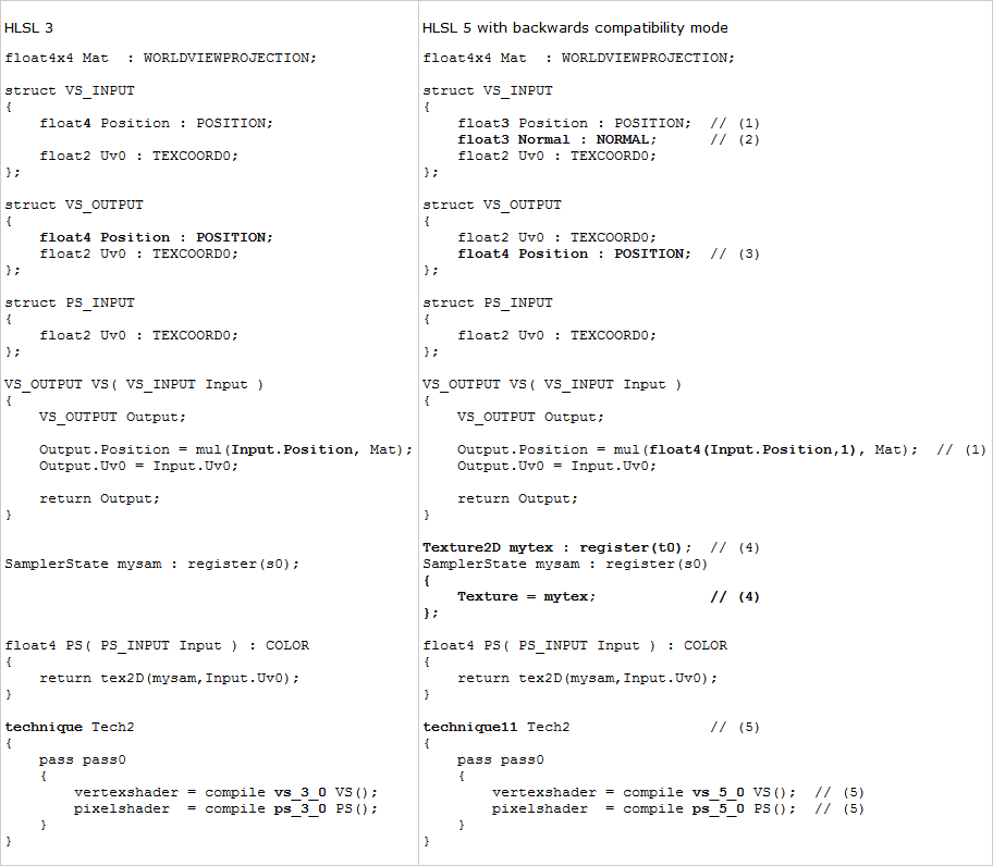 Since we are now compiling for shader model 5.0, the technique keyword must be replaced by technique11 and the shader models must be updated from xs_3_0 to xs_5_0