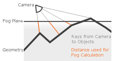 The Ground Fog basically works the same as the normal fog but extends it by one functionality: It will calculate the distance to either the camera position or a defined plane in space, whatever comes first. This way you can create a look of fog that stops at a certain height. The image below illustrates this: