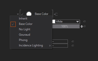 The Base Color Mode inherits the Lighting Model used in the scene or the Material Node in front but is able to overwrite its Base Color property and Opacity. This can e.g. be used to quickly change the color of a 3D Object very quickly.