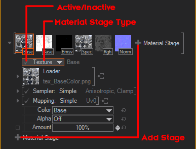 The first step is always to load a texture. Any kind of Material Stage must contain a Texture, even a generated 1D Gradient is a Texture. After a Texture has been loaded it will be Sampled and Mapped onto a Polygon - Here you can decide HOW it should be projected onto the Polygon. E.g. you could set the Sampler to an Advanced Mode and define to Wrap the texture around the UVW. If you, for instance, decide to change the Position of this texture, it will Wrap around and repeat itself. In some Controls you can decide how Intense the Texture will be projected onto that polygon or the surface. For some Material Stages, you have different controls. At the end you have to Assign that Texture into a Slot - which is handled separately for the Color and the Alpha of the Texture. For example, you could assign the Color of a Texture to go into the BaseColor Slot, while the Alpha has to control the Roughness.