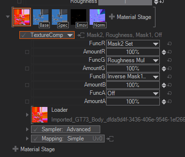 With the TextureComp stage you can load a texture and split it into the R,G,B,A channels and assign every channel to an own target channel. This for example makes it possible to assign the Red Channel Information to control the Roughness, Green channel can be the Ambient Occlusion and Blue can control the glossiness. It is basically the same as using the texture sets but with the TextureComp stage you have full control over each individual channel and dont need to take care of a specific naming convention.