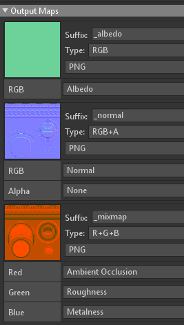 | Substance painter Preset | Suffix | Stage | Channels |