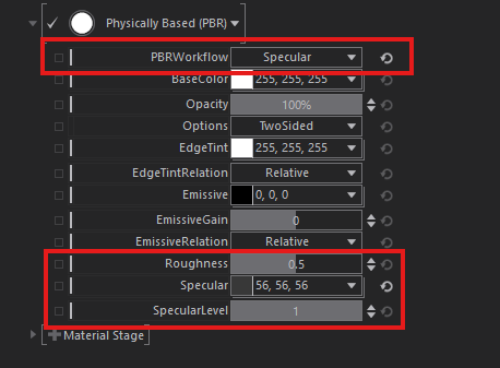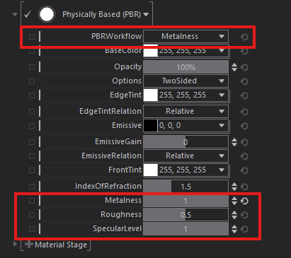 The Physically Based (PBR) specific properties are PBRWorkflow which can be set to either Metallic or Specular. Switching between these will hide or show different properties to define the material.