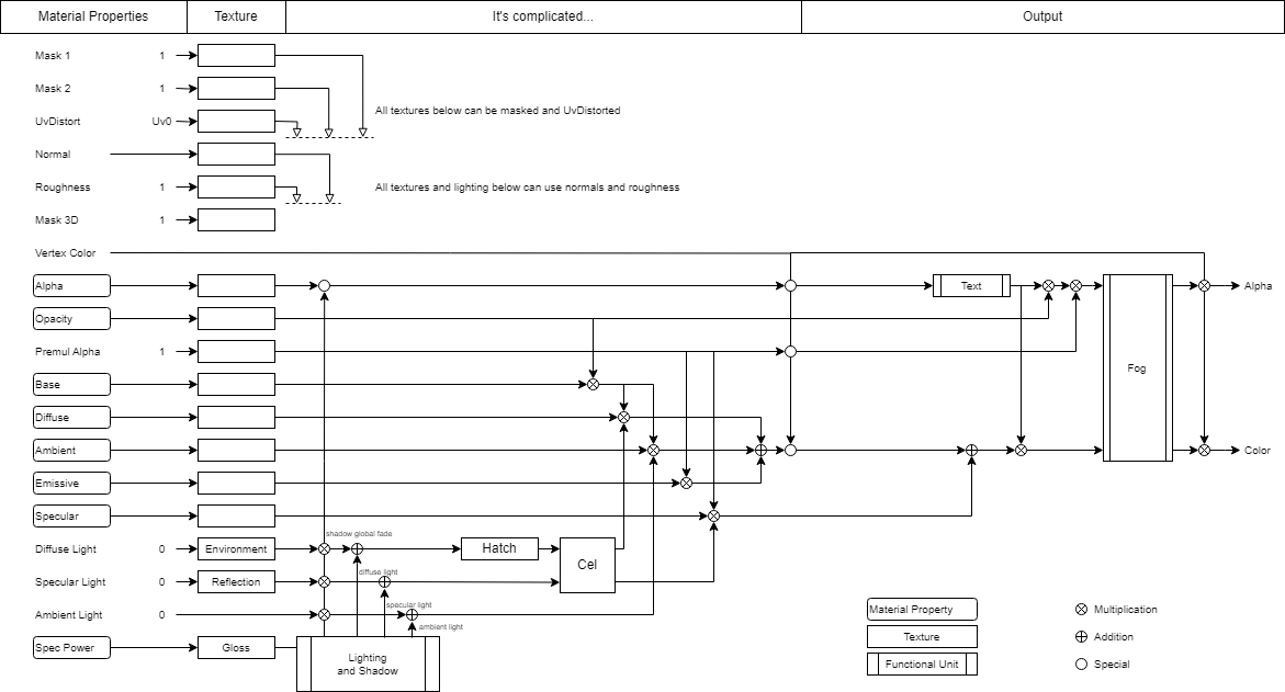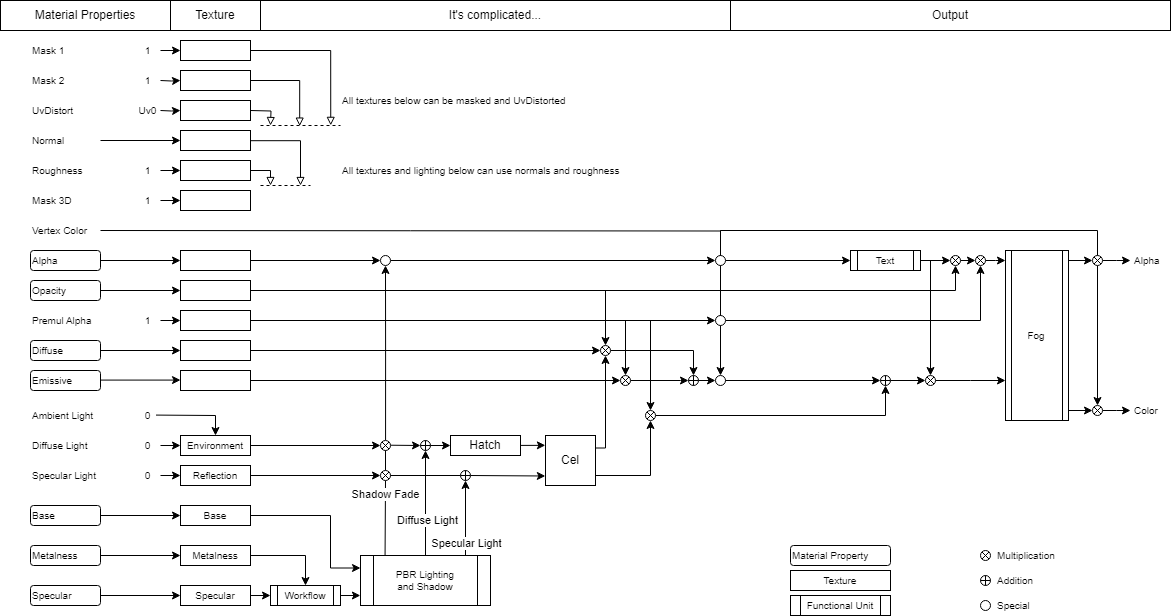 We also provide you with a diagram for the non-PBR- and PBR Workflow, to visualize how the material system in Ventuz works. The detailed block diagrams shows how the various material properties are combined: