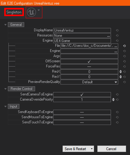 In some cases it makes sense not to start the same Unreal Engine Project with the same parameters like resolution for each Ventuz Pipe, which is the default case if you use Singleton. This is for sure the case if you want to use [Introduction Ventuz Director] in Preview/Program Mode to run your Virtual Studio. To do so simply  click the word Singleton to change the Mode to Multipipe.