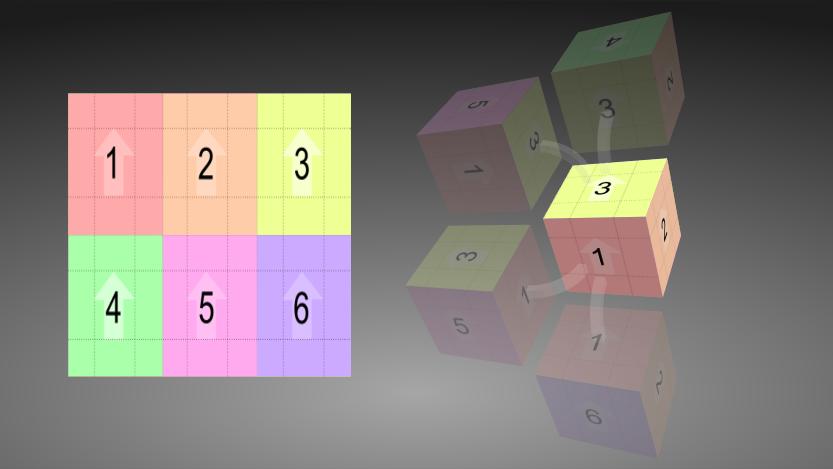 The Cube Node offers two ways to generate UV coordinates. Flat assigns the same planar coordinates to each face where Dice uses a different portion of the unit square for each face. The following example shows a 3x2 texture and the way it is mapped to the different faces of the cube: