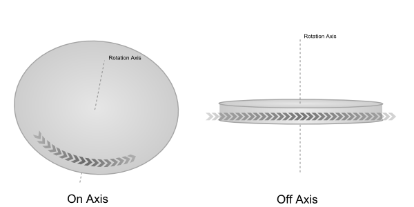 The off-axis mapping mode assumes that the rotation axis is at roughly a 90 degree angle to the viewing direction (i.e. a slot machine). When rotating, the object will only stick to the touch position up to a certain point. As the touch gets closer to the boundary of the object, a different mapping is used so that moving the touch further along will keep the object rotating at a constant speed. While one looses the feeling of the object sticking exactly to the finger, this mode feels much nicer when it comes to making an object spin.