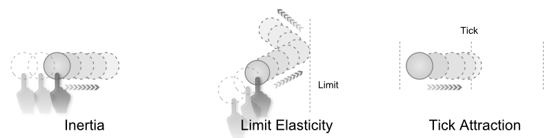 All transformation nodes contain a simplified physics model to simulate effects like inertia or other post-motion. Subtle effects like these are crucial to convey realism or "weight" in a MultiTouch scene.