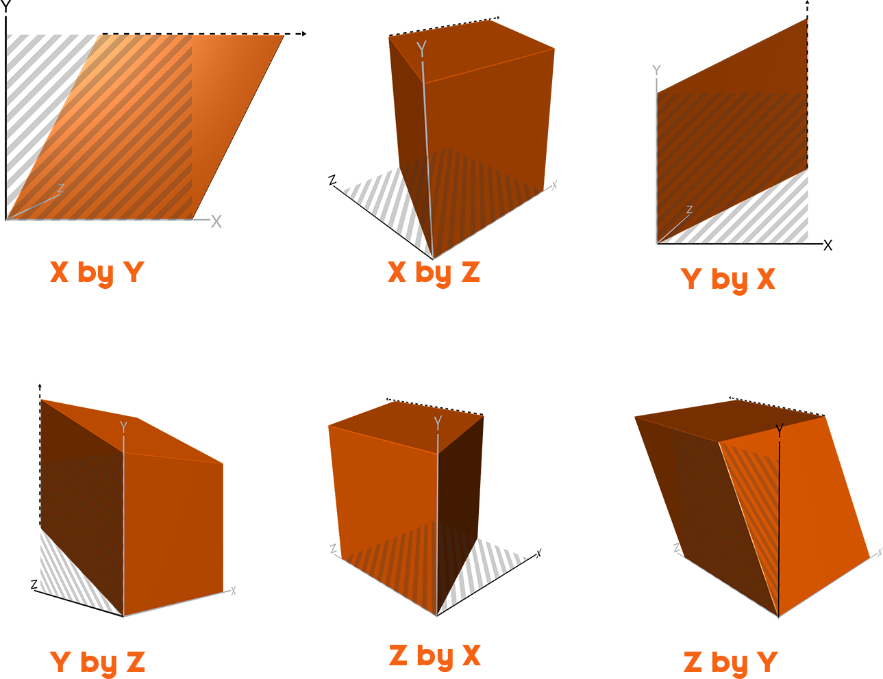 The Axis Property allows you to select the axis where the shearing is applied to. X by Y in that sense means the object is sheared along the X axis on the X-Y Plane. With the Amount property the strenght of the transformation in percentage can be adjusted whereby an Amount of 100 results in an angle of 45 degrees.
