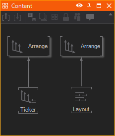 If the scene requires displaying multiple elements of the same type at the same time (a stock crawl usually displays multiple quotes within one line), multiple copies of the element have to be created and added as children of the arrange node. The Arrange Controller keeps track of which nodes are currently already in use and uses the child nodes as a pool from which it can temporarily acquire elements.