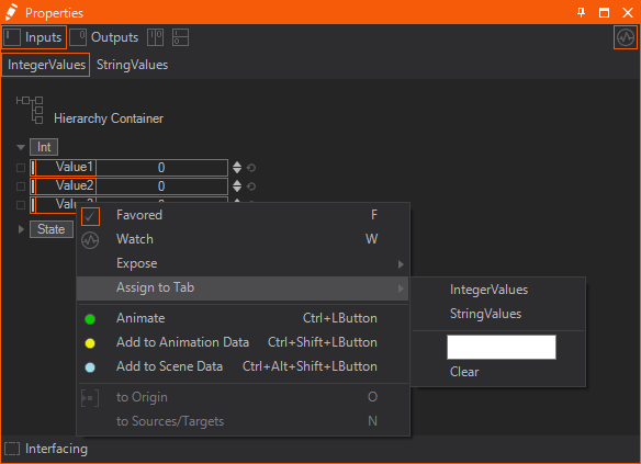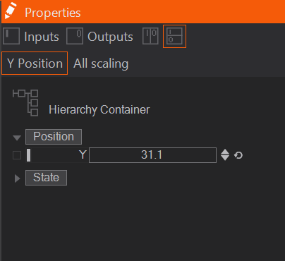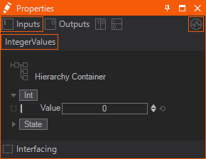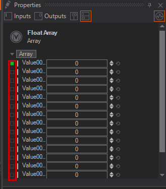 The top row of buttons selects whether only input, only output or both property types in a split view should be shown. The button on the top right is the Monitor Values button. When activated, the user interface will update the shown values every frame. This causes a small performance penalty but is great for understanding what is happening in a scene. When deactivated, the values are only updated when the selection changes or the user chooses another of the four view buttons (input, output, splits).