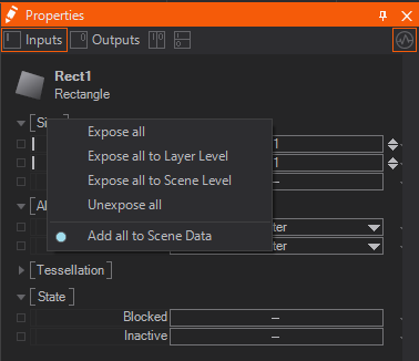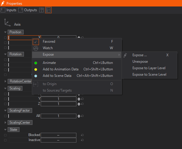 Since Ventuz 5 we introduced a new level in the Scene with Layers. To make exposing a little more handy properties can be exposed to Layer Level or Scene Level directly from the context menu. Pressing the on a category also allows exposing all properties inside that category to a certain level in the scene or to Scene Data to control them from Ventuz Director.