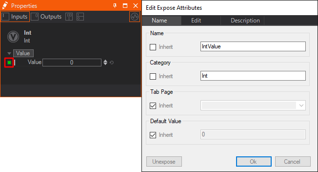 To expose a property, click on the name of the property in the Property Editor and choose Expose/Edit... from the appearing context menu. The name and category of the property, as it appears on the Layer or Container, can either be kept the same as on the original node or be reassigned in the dialog that opens. Press OK and the square to the left of the property name will change to green, symbolizing that this is now an exposed property. Note that exposed property names have to be unique within a container. Exposing two properties with the same name will not only confuse other Ventuz operators but can also disrupt the binding logic.