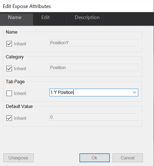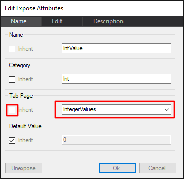 If inheriting is enabled the exposing will appear on the same tab like the exposed property. To change that uncheck the according checkbox. When changing the name you can also use the dropdown to choose from a list of already present property tabs of the current container.