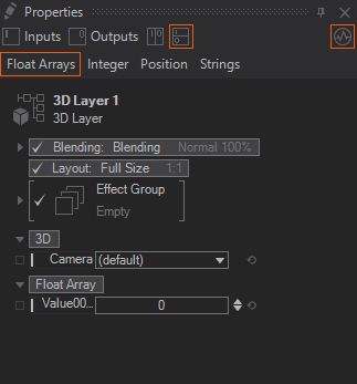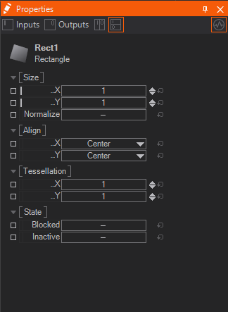 The Property Editor lists the input and output "parameters" of the node selected in the Layer Editor, Hierarchy Editor or Content Editor. It also displays the properties of selections in other editors, such as the Animation Editor or Project and Scene Data. Only the properties of Nodes can be bound to other nodes or can be animated. Other properties shown in the Property Editor can only be viewed or edited.