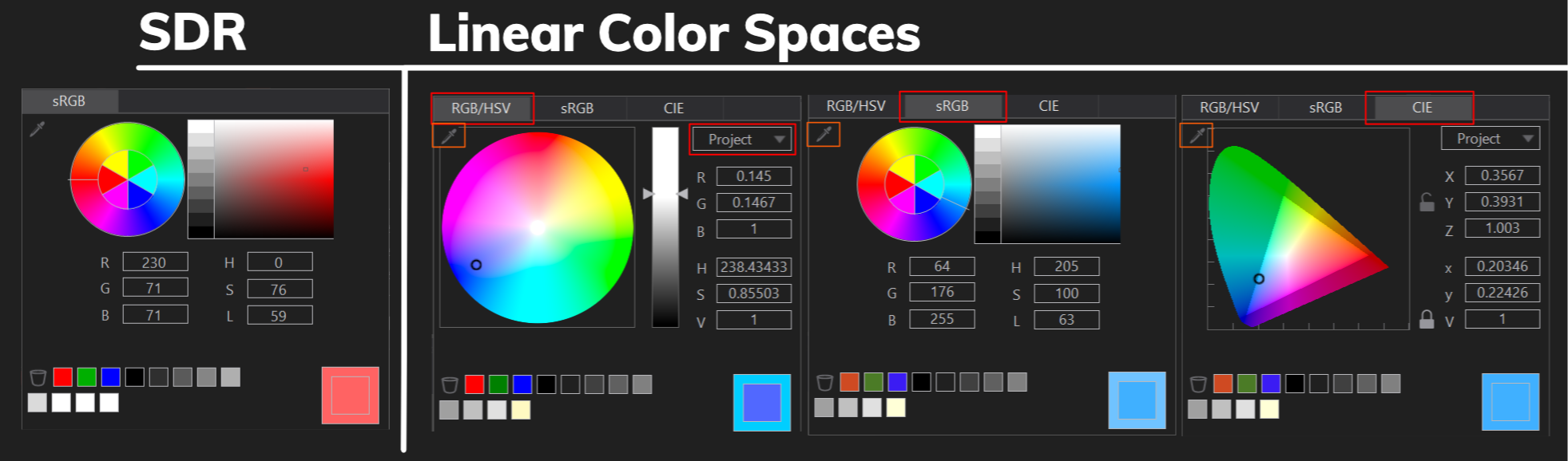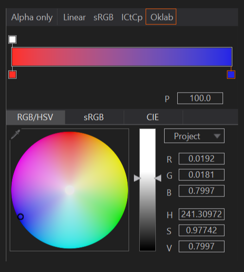 RGB/HSV uses a Hue and Saturation circle in combination with a Value (brightness) slider. The color shade is separated from the brightness level. The values can be set via RGB or HSV float numbers directly. This is the main tab to work in linear spaces. With the dropdown selector the color space of the Color Selector can be changed. The shown values are in the selected color space but will be internally transformed to the Project Color Space.