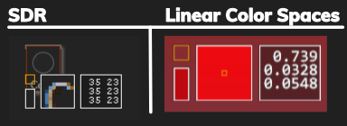 Color Values can be changed in several ways and somehow exceed the ways you can change values of other types. You may choose whichever is most comfortable. By clicking the downwards arrow of the Value Column a small window opens, where you can edit the current property. Depending wether you are working in a SDR or HDR Layer / Workflow, the Color Selector shows different editors.