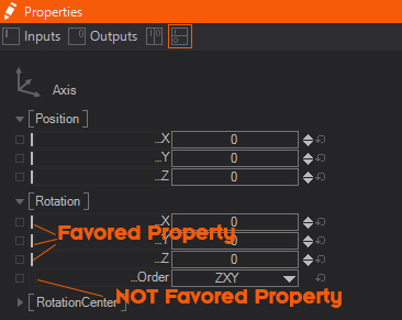 A property is favored to indicate that it is among the ones that are most often used by a typical user. This is visualized by a light gray bar on the left of the name column (in this case only the X/Y properties). The Properties Editor always shows all available properties, the favored tag is just applied to the Quick-Properties Editor available in the Hierarchy Editor on hovering the right bottom of a Node.