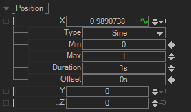To change the values you can click to uncollapse the property. The Type changes the function of the animation, Min and Max adjust the range, Duration will change the time for one iteration of the animation and Offset defines an offset for the start of the animation.
