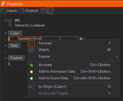 If an input property is bound, the menu entry to Source Node will navigate to the node which is bound to the selected property. The navigation to Property is only possible if the Favored option is enabled. In this case, a Hierarchy node inherits the favored input properties of all bound nodes for display in the Property Editor. Selecting to Property on such an inherited property will navigate to the real owner of this property.