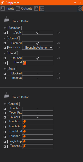 Most properties represent values that influence or are generated by a node. A number of nodes also generate or listen to events that fire when a certain situation arises. The following screenshot of the Touch Button node shows both input and output properties and events.