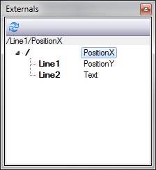 In order to access Properties, Methods and Events of a Ventuz Scene, it is necessary to externalize such elements. So called Externals are represented as concatenated names organized in a folder structure. Externals are always addressed with their full qualified name (e.g. /Line1/PositionY) where the leading / (slash) must always be present.