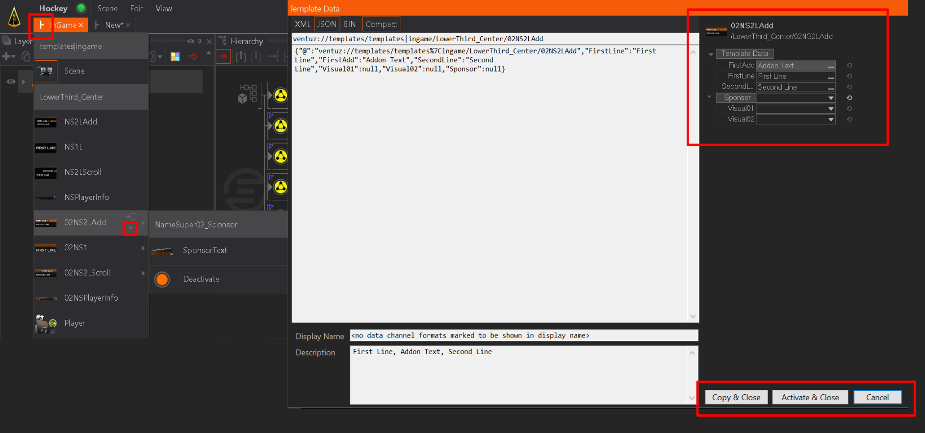 On the right side, the interactive editor can edit the Template Data items, with the standard Property Editor. With Activate & Close the Template is launched with the current data structure.
